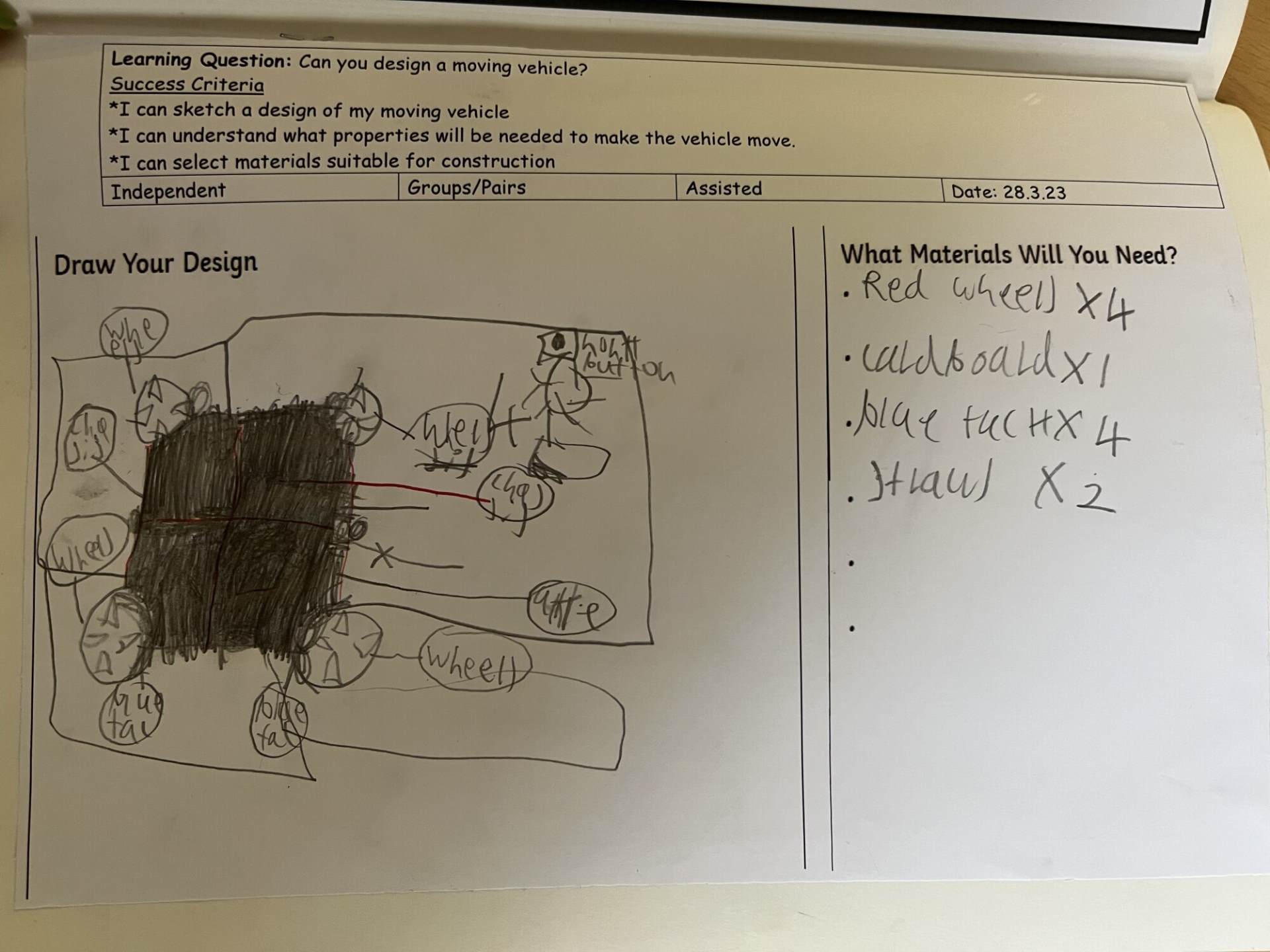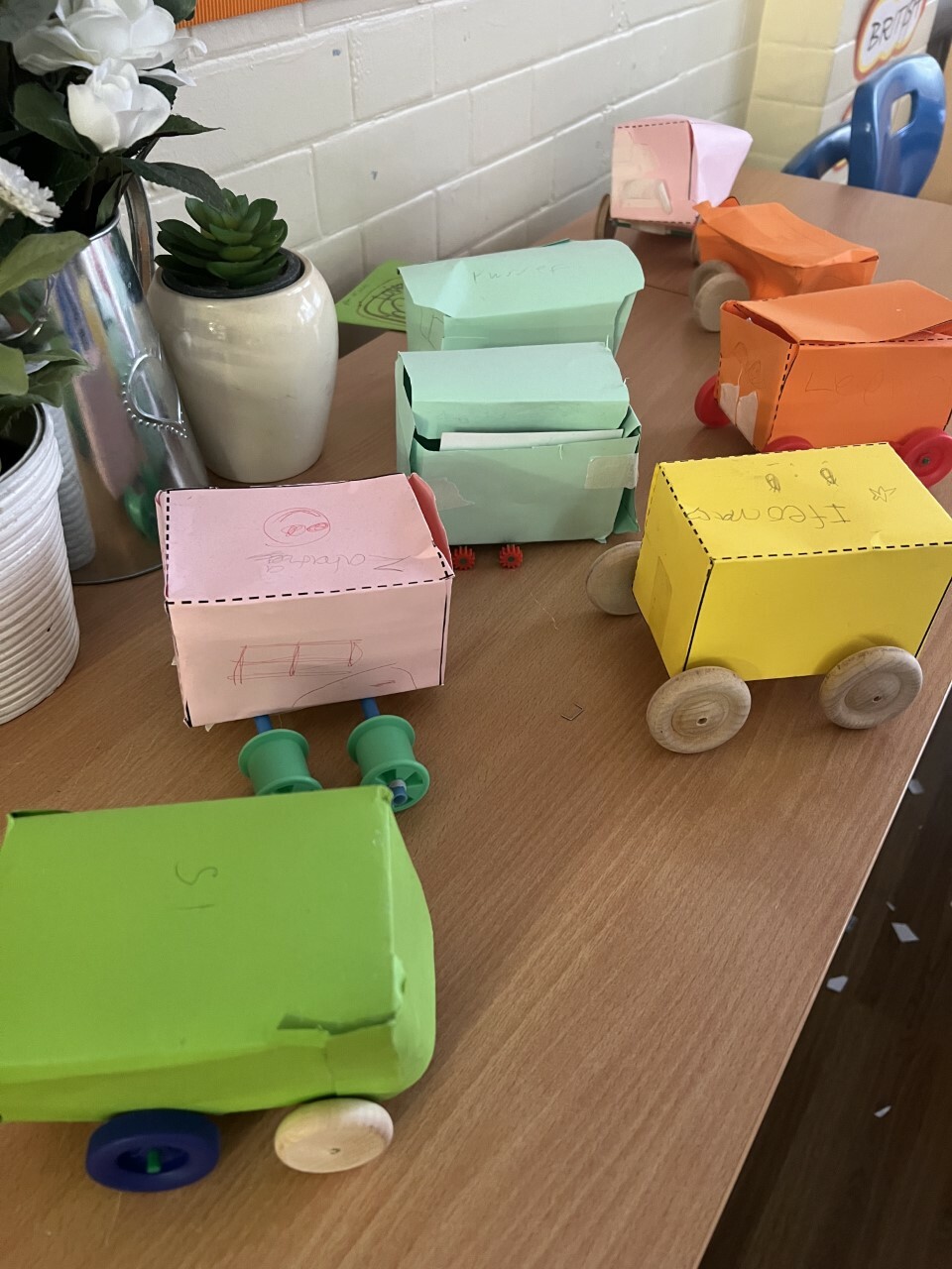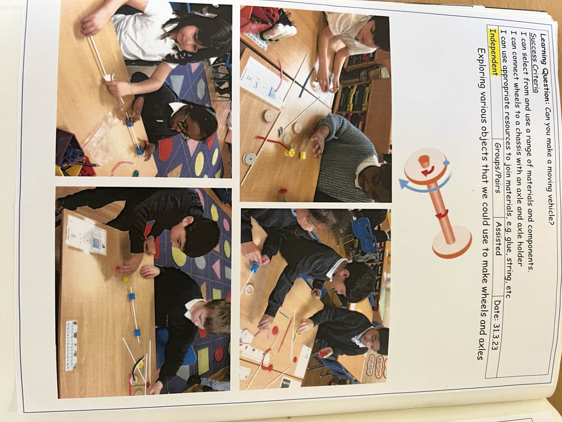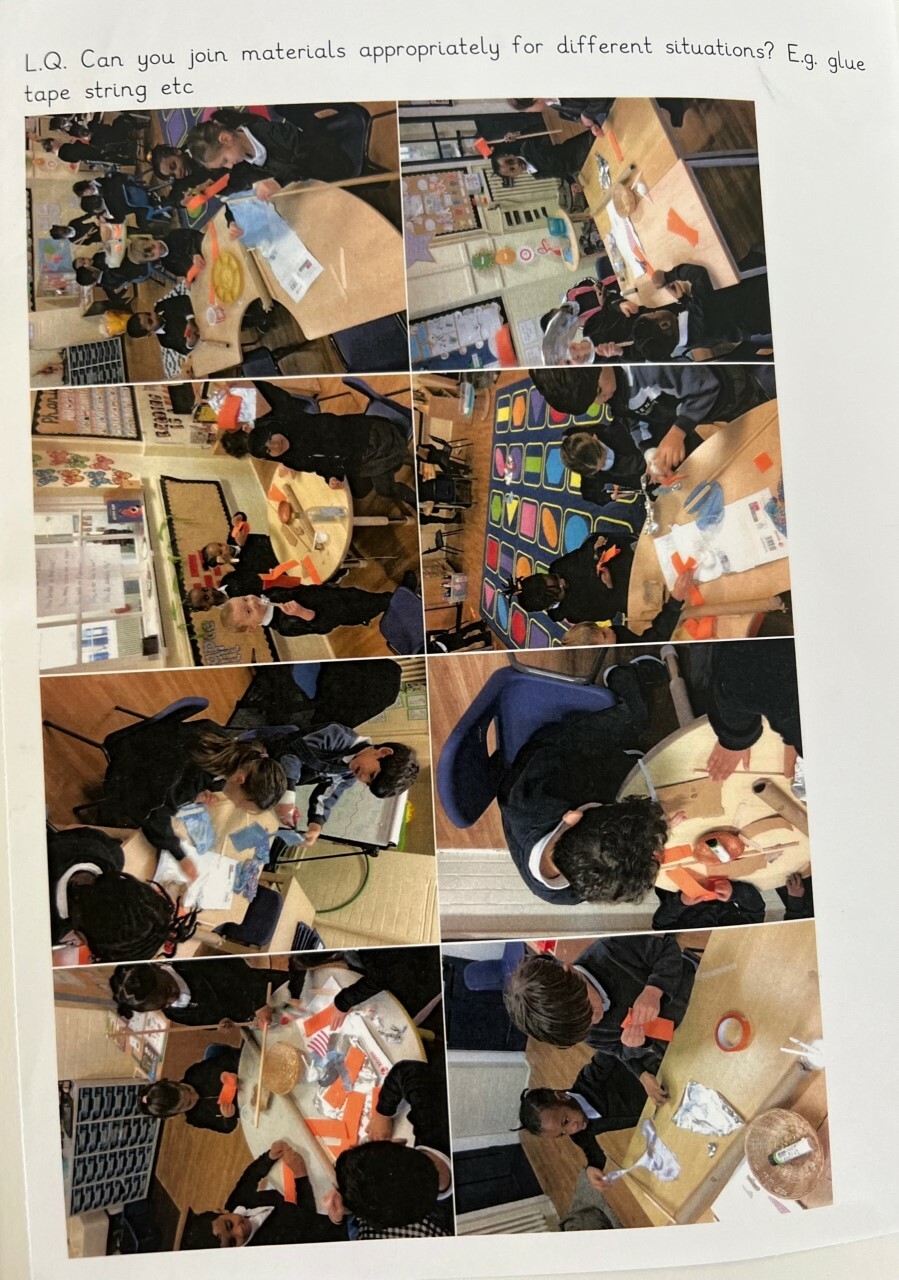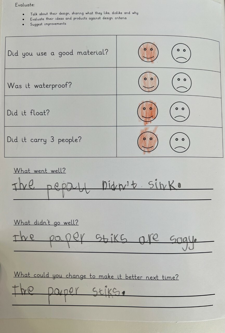 Pupils are encouraged to evaluate their work by discussing what they like and dislike and suggesting improvements. They also start to build an understanding of structures, exploring ways to make them stronger and more stable, and experiment with simple mechanisms such as levers and sliders.