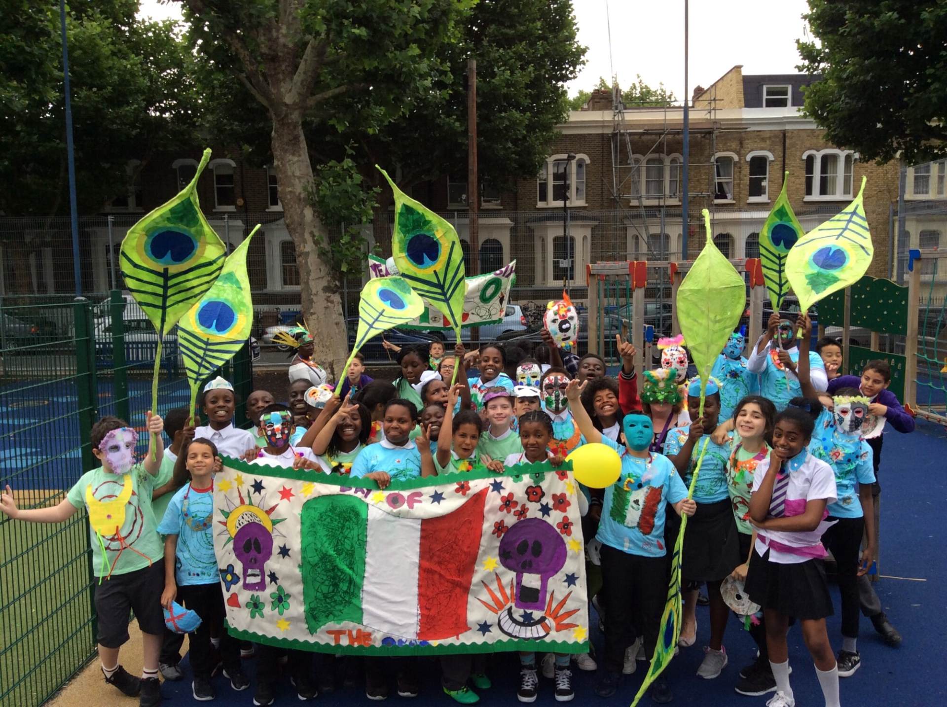 Through art, design and DT, the children get an opportunity to really show their creativity, making banners, costumes, hats, masks, musical instruments, large pieces of art and much more. Dancing and singing to the music of our samba band, we take our carnival around the community, who come out to watch, dance and cheer us along.