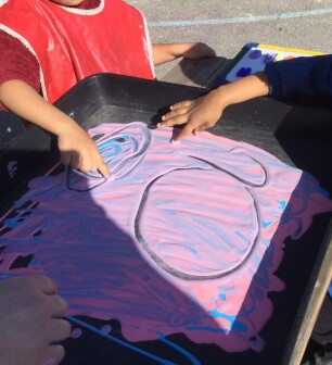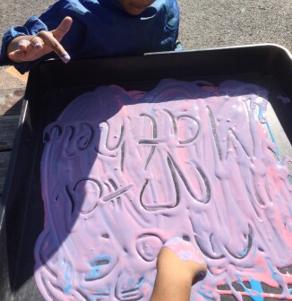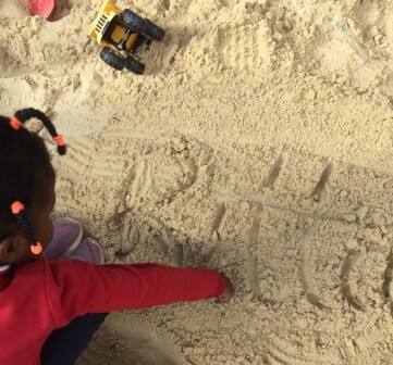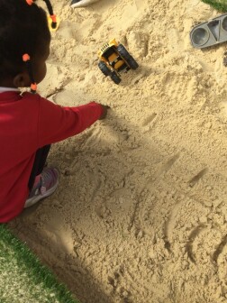 Throughout the learning environment, there are role play areas and activities that encourage talk, and provide places to make marks and form letters in a range of materials, such as sand and paint. They can write their own ideas during their play in structured activities. Adults create opportunities that encourage language development: growing their vocabulary, giving them models for talk, and leading into writing.