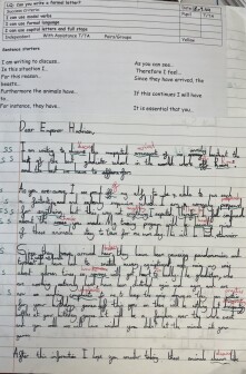 In year five, children continue to write for a range of purposes and audiences, showing a greater awareness of the reader. Children learn to make choices about grammar and vocabulary to use within their writing, and to select appropriate layout features for the text type. Children show greater confidence in selecting adverbials, prepositions and conjunctions to build cohesion within and between paragraphs. In narratives, children consider the balance between dialogue and action, and how dialogue can be used to move a story along.