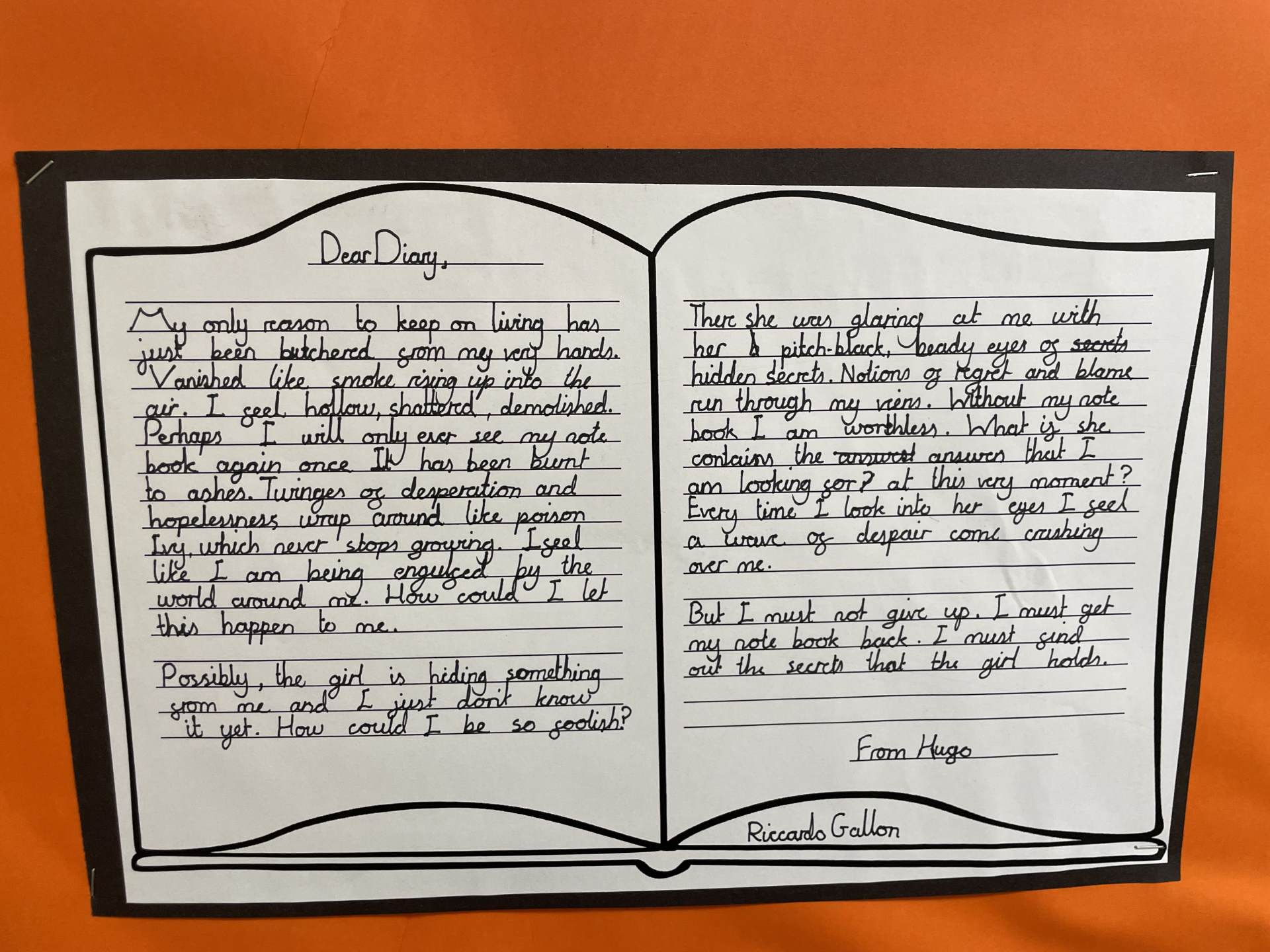 In year 6, children learn to confidently write for a range of purposes and audiences, including a focus on formal and informal writing features. They broaden their vocabulary through shared class texts, exploring how writers develop characters and plots, make decisions about vocabulary and grammar within their texts, and how different layout features are employed for different text types. They incorporate these ideas into their own writing. Children secure the correct use of the full range of punctuation, including the use of brackets and dashes for parenthesis, and colons and semi-colons.