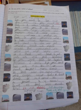 In year five, children continue to write for a range of purposes and audiences, showing a greater awareness of the intended reader. Children learn to make choices about grammar and vocabulary to use within their writing, and to select appropriate layout features for the text type. They begin to make choices around the use of sentence types for effect.