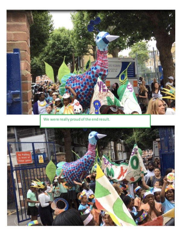 Through art, design and DT, the children get an opportunity to really show their creativity, making banners, costumes, hats, masks, musical instruments, large pieces of art and much more. Dancing and singing to the music of our samba band, we take our carnival around the community, who come out to watch, dance and cheer us along.
