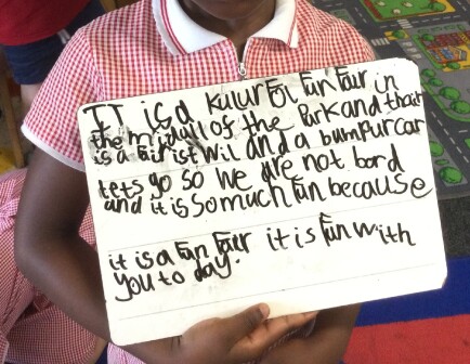 Throughout the learning environment, there are role play areas and activities that encourage talk, and provide places to make marks and form letters in a range of materials, such as sand and paint. They can write their own ideas during their play in structured activities. Adults create opportunities that encourage language development: growing their vocabulary, giving them models for talk, and leading into writing.