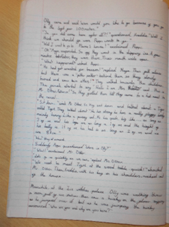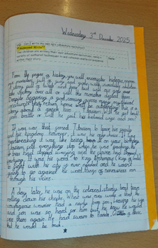 They begin to use speech within narrative, using inverted commas based on modelled writing. Children introduce adverbs to their writing and begin to use more precise prepositions. They should begin to use more adventurous vocabulary as they begin to read more advanced texts. Sentence structure should now be embedded and used correctly. Handwriting should be joined.